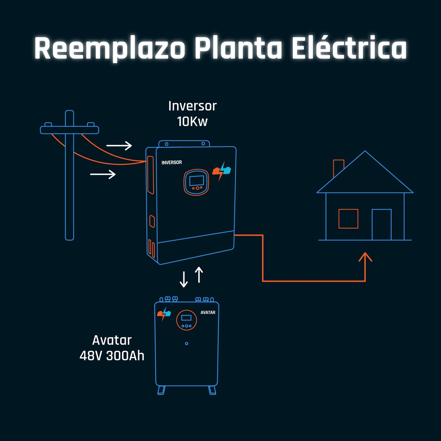 Este sistema utiliza el mismo principio de inversor All-in-One y banco de baterías en 48V, funcionando como un UPS de gran capacidad. Proporciona respaldo inmediato y silencioso ante cualquier corte de energía, sin necesidad de combustible ni mantenimiento constante como en una planta eléctrica tradicional. Es la solución ideal para garantizar continuidad eléctrica en tu casa o negocio de manera limpia, segura y eficiente.