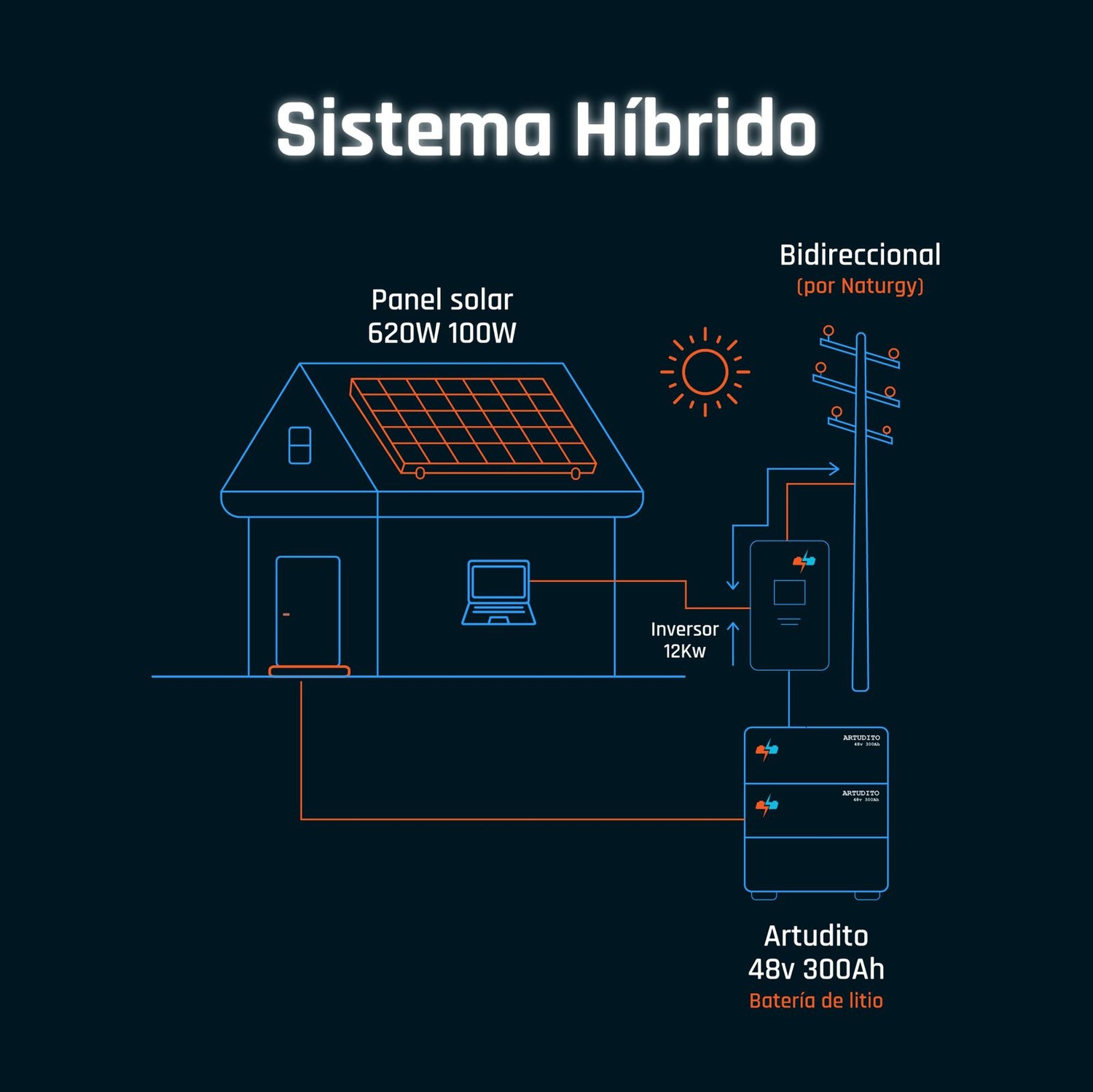 Este sistema utiliza un inversor All-in-One (AIO) de 10 kW o 12 kW, que gestiona de forma automática la energía de los paneles, la red y las baterías. De esta manera, siempre cuentas con energía confiable, incluso cuando la red eléctrica falla.