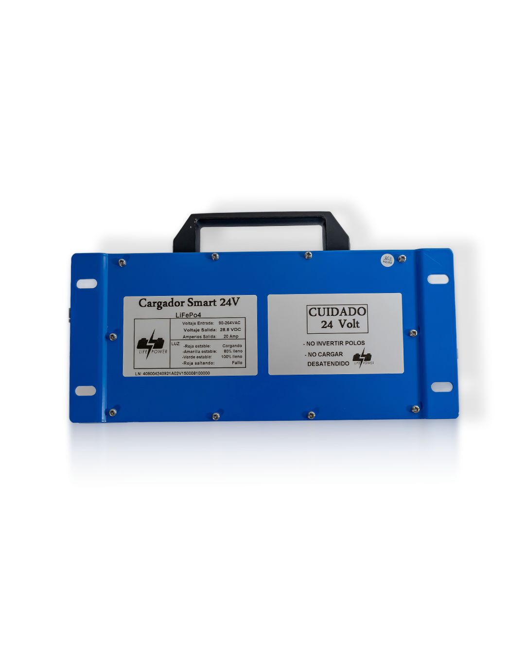 El Cargador Inteligente LifePower 24V está diseñado especialmente para baterías LifePower LiFePO4, ofreciendo una carga segura, eficiente y optimizada para prolongar la vida útil de las baterías. Con su tecnología avanzada y múltiples protecciones, es ideal para mantener las baterías siempre listas y protegidas, incluso si se mantiene conectado permanentemente. Sus características principales son una clasificación IP65 (resistente al polvo y salpicaduras), protección contra sobre-temperatura, sobre-voltaje, sobre-tensión, polaridad inversa y cortocircuitos. También tiene protección para carga de larga duración y está diseñado para permanecer conectado a la batería de forma permanente, apagando la carga cuando esta está llena. Las especificaciones técnicas son: voltaje de entrada de 110–240 V AC con frecuencia de 50/60 Hz, voltaje de salida de 29.2 V DC y amperaje de salida de 20 A. La corriente máxima de carga es de 20 A / 584 W, con una eficiencia de carga de un 91% o más. Es compatible con baterías LifePower LiFePO4. Como nota de seguridad, se advierte no conectar con polos inversos. Los indicadores LED de estado son: verde estable (100% lleno), amarillo estable (80% lleno) y rojo estable (cargando). Los indicadores de advertencia son: rojo saltando 1/2 (polaridad inversa), rojo saltando 1 (sobre corriente), rojo saltando 2 (sobre voltaje), rojo saltando 3 (bajo voltaje), rojo saltando 4 (sobre temperatura) y rojo saltando 5 (falla de batería). Sus beneficios clave son la alta eficiencia para una carga rápida y segura, indicadores claros para un monitoreo fácil, una construcción robusta con protección IP65 y que soporta el uso continuo para mantener la batería en óptimo estado.